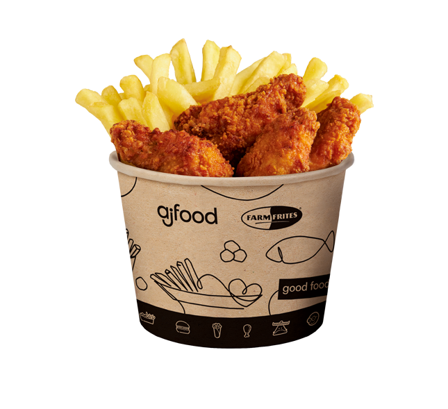 stripsy z kurczaka 3szt. (ok. 135g), popsy z kurczaka 10sz6t, (ok. 100g), frytki 200g, sos -