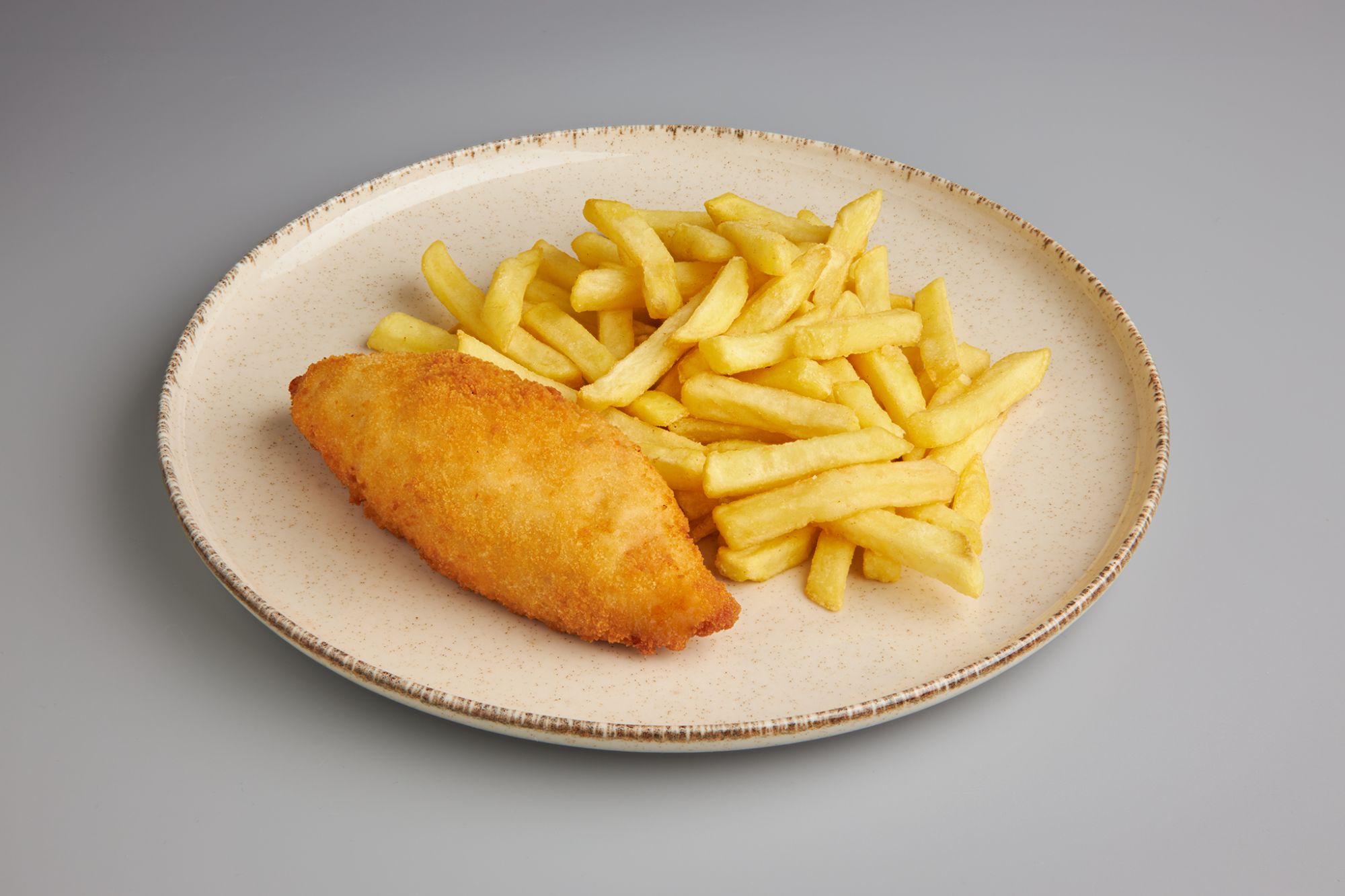 ryba w cieście 5szt., krewetki baby w cieście 5szt., frytki 200g, sos