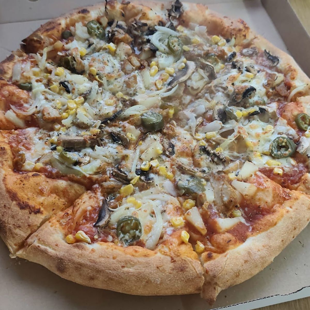 sos pomidorowy, ser, pieczarki, papryka, oliwki, suszone pomidory, kukurydza, cebula -