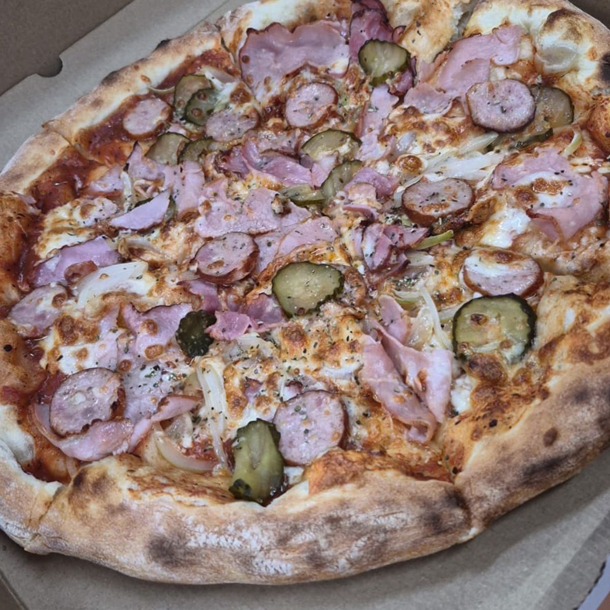sos pomidorowy, ser, salami pepperoni, kiełbasa, boczek, pieczarki -