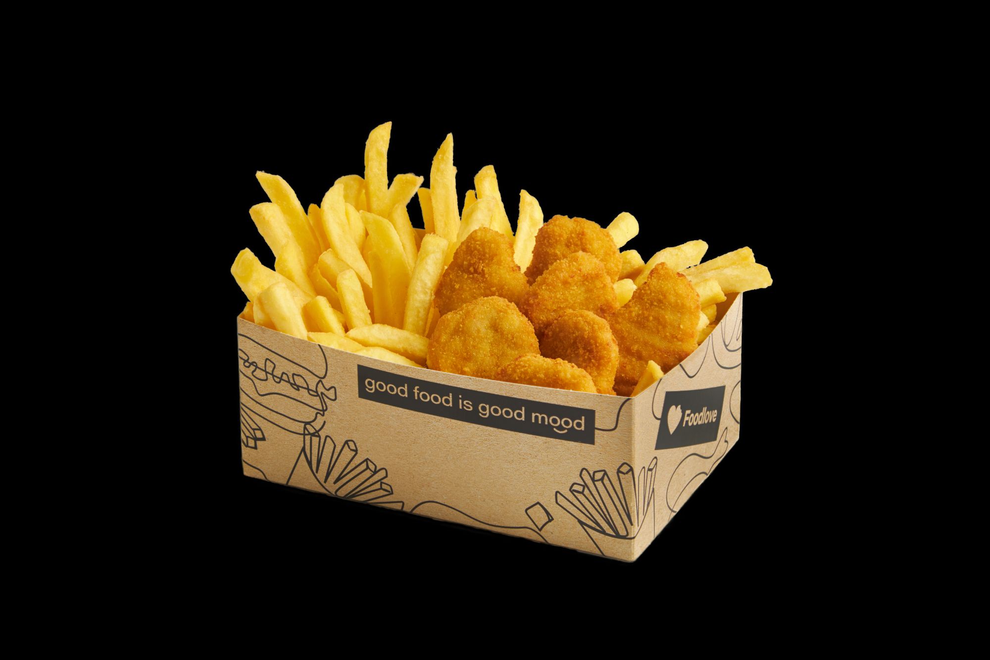 stripsy z kurczaka 3szt. (ok. 135g), popsy z kurczaka 10szt, (ok. 100g), frytki 150g, sos -