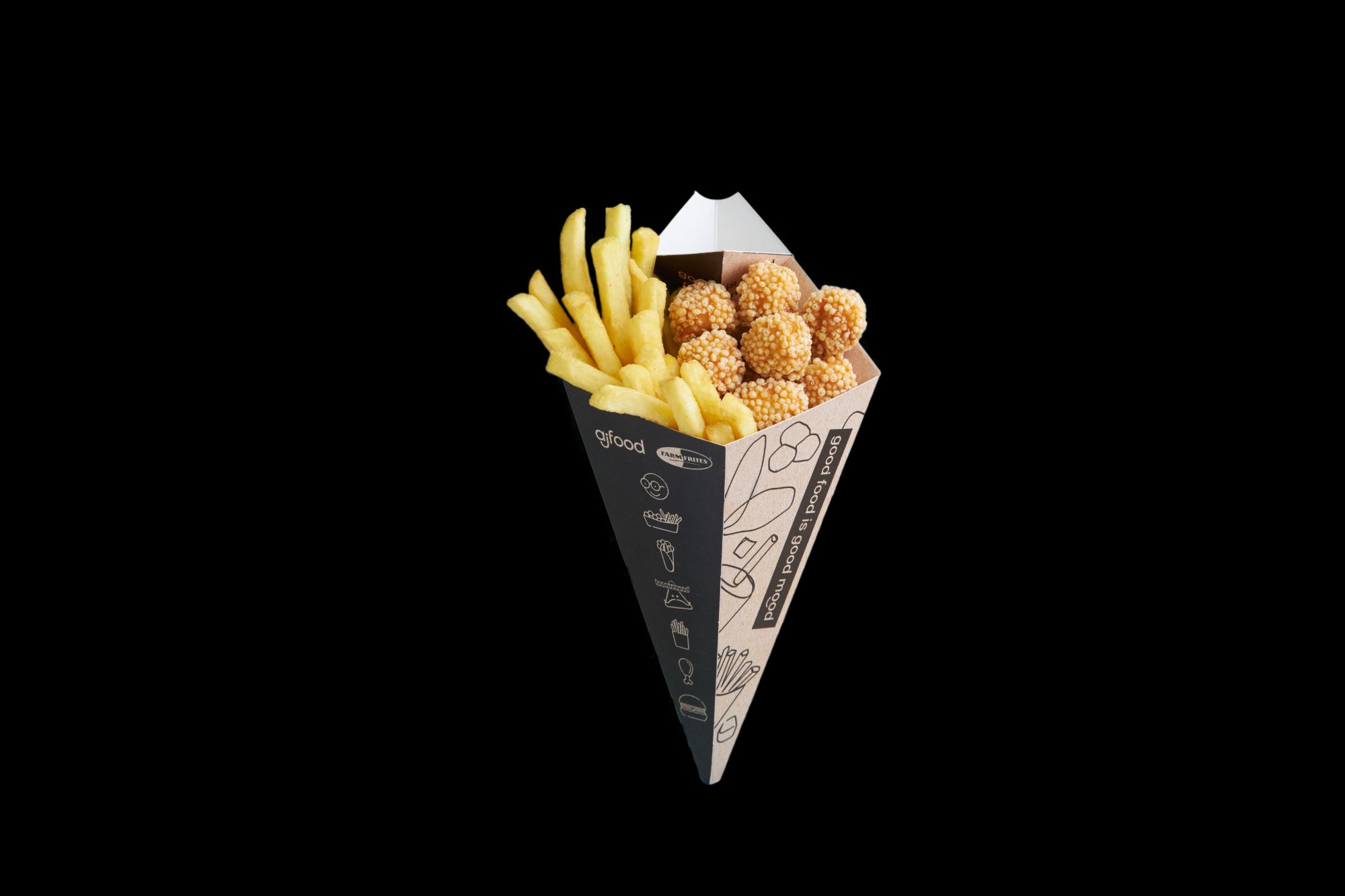 ryba w cieście 5szt., krewetki baby w cieście 5szt., frytki 150g, sos